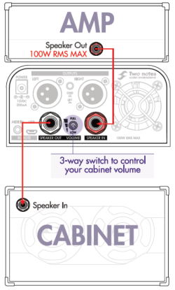 | Always connect the speaker output of your tube amplifier to an appropriate load (speaker cabinet or load box). The Captor X SE is such a load. The Captor X SE does not need to be powered up to act as a load box. The maximum admissible power of the Captor X SE is 100W RMS, your amplifier shouldn't be set to play at a higher output power value. See this article if your amplifier is more powerful than 100W. |